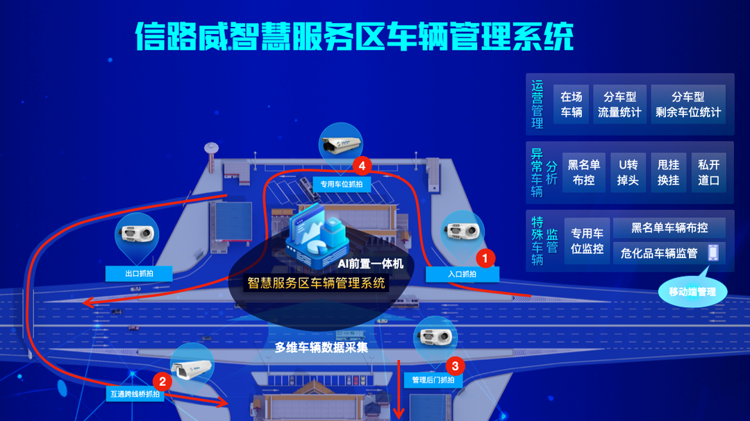 信路威智慧服務(wù)區(qū)車輛管理系統(tǒng),通過在服務(wù)區(qū)入出口匝道、內(nèi)部互通通道、專用車位等位置部署智能識別一體機,實現(xiàn)對服務(wù)區(qū)所有通道的車流全覆蓋識別,精準采集通行車輛的多維數(shù)據(jù);同時運用公眾號/小程序等實現(xiàn)對?;返溶囕v進行無紙化管理;對異常車輛進行分析處理,在服務(wù)區(qū)入出口抓拍,深挖貨車換掛、貨車換牌的違法行為,對在服務(wù)區(qū)內(nèi)的U轉(zhuǎn)行駛、私開道口等可疑逃費行為進行全景監(jiān)管,為高速收費稽核提供服務(wù)區(qū)關(guān)鍵節(jié)點的輔助核查數(shù)據(jù)。