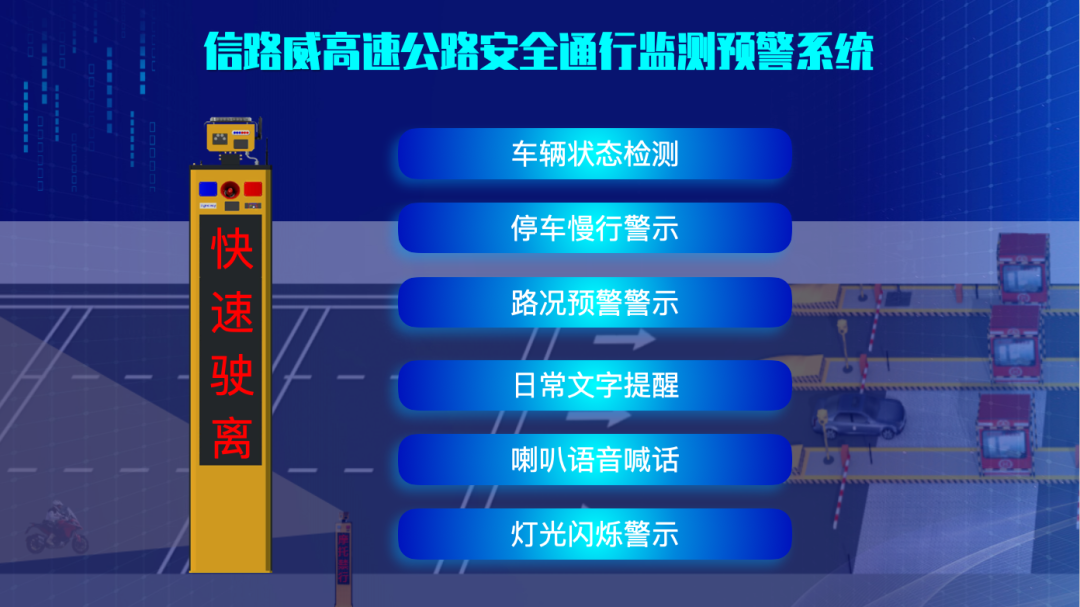 信路威以AI賦能,助力高速公路安全通行,推出高速公路安全通行監(jiān)測預警系統(tǒng),在分流匝道路口、匯入匝道路口、隧道、下坡、彎道、雨雪霧等重點路段部署智能設(shè)備“高速哨兵”,可實現(xiàn)車輛狀態(tài)檢測、停車慢行警示、路況預警警示 、日常文字提醒、喇叭語音喊話、燈光閃爍警示等功能,降低了高速公路事故率和死亡率,為高速行車安全風險進行預警和提醒。