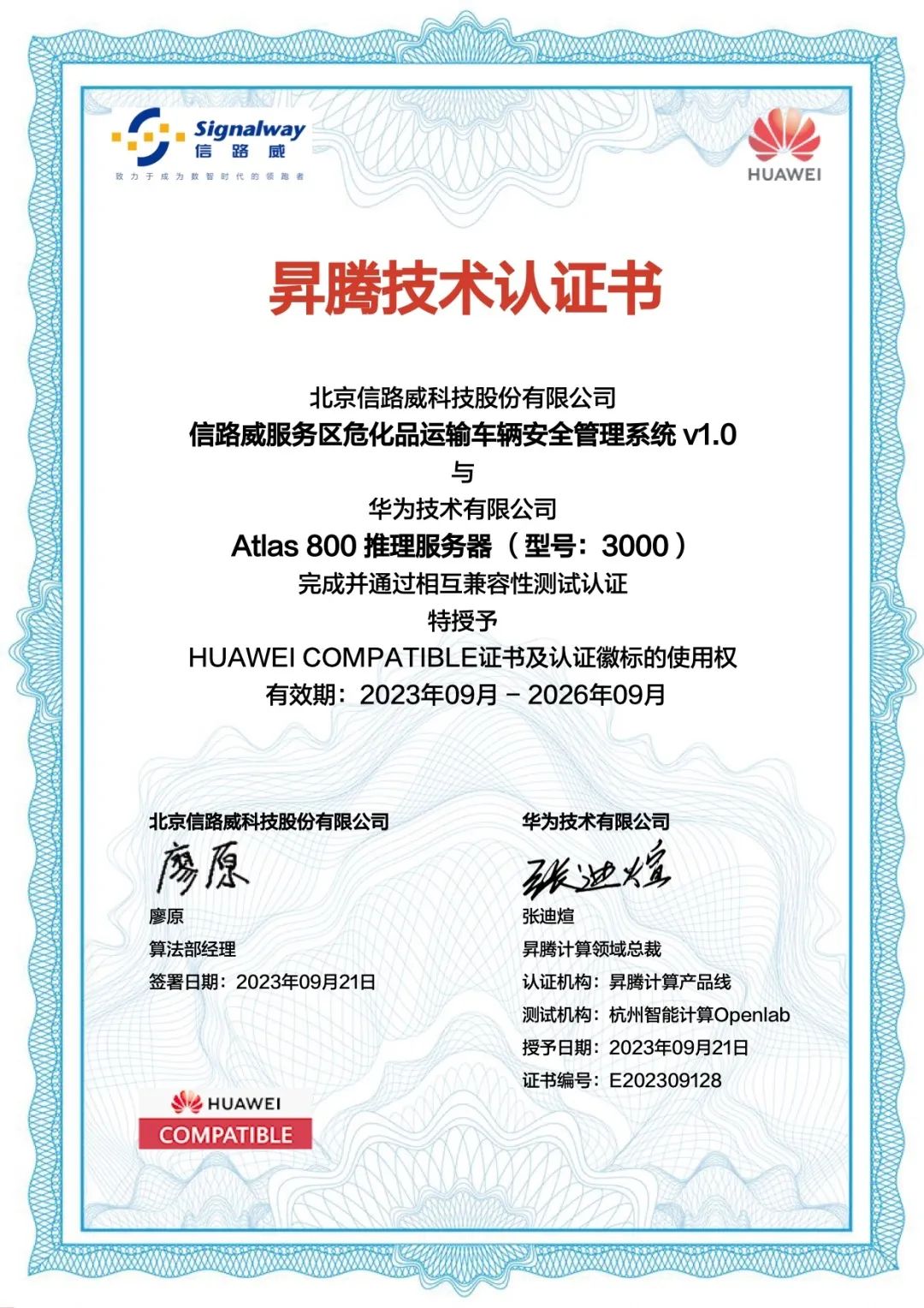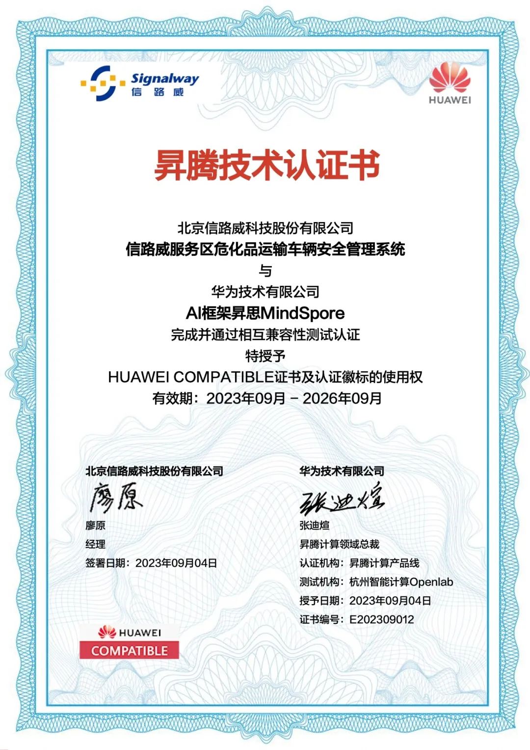 近日,信路威服務(wù)區(qū)危化品運輸車輛安全管理系統(tǒng)與華為AI框架昇思MindSpore、Atlas 800推理服務(wù)器(型號3000)、Atlas 800訓(xùn)練服務(wù)器(型號9000)的相互兼容性測試,可充分滿足相關(guān)行業(yè)安全性、可靠性、穩(wěn)定性的應(yīng)用需求,信路威獲得了HUAWEI COMPATIBLE 證書及認證徽標的使用權(quán)。