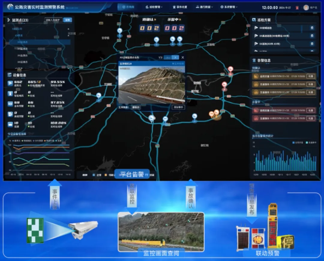 信路威新推出第一代“災害(邊坡/橋梁)在線監(jiān)測及智能預警系統(tǒng)”,依托信路威視覺大模型,實現(xiàn)全天候精準監(jiān)測,實時感知路面異常。當系統(tǒng)檢測到異常時,立即觸發(fā)“AI監(jiān)控報警-云端確認與處置-現(xiàn)場聲光示警聯(lián)動”三級響應機制,快速提醒監(jiān)控人員處理,并聯(lián)動現(xiàn)場示警設備。通過開啟紅藍閃爍燈、高亮LED屏及語音播報等多模態(tài)預警手段,主動引導后續(xù)車輛,提示前方道路異常,有效降低道路安全事故發(fā)生概率。事件處置完成后,系統(tǒng)會自動生成詳細報告。系統(tǒng)廣泛適用于山區(qū)公路、高速公路的高危邊坡及橋梁的安全監(jiān)測。