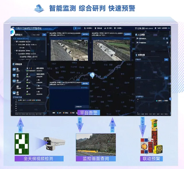 針對(duì)公路邊坡與橋梁等結(jié)構(gòu)的安全隱患,信路威推出公路災(zāi)害(邊坡/橋梁)預(yù)警系統(tǒng)。該系統(tǒng)采用微光靶標(biāo)與超黑光AI相機(jī),實(shí)現(xiàn)全天候精準(zhǔn)監(jiān)測(cè),實(shí)時(shí)感知結(jié)構(gòu)形變。當(dāng)系統(tǒng)檢測(cè)到異常時(shí),立即觸發(fā)“AI監(jiān)控報(bào)警-云端確認(rèn)與處置-現(xiàn)場(chǎng)聲光示警聯(lián)動(dòng)”三級(jí)響應(yīng)機(jī)制,快速提醒監(jiān)控人員處理,并聯(lián)動(dòng)現(xiàn)場(chǎng)示警設(shè)備。通過(guò)開(kāi)啟紅藍(lán)閃爍燈、高亮LED屏及語(yǔ)音播報(bào)等多模態(tài)預(yù)警手段,主動(dòng)引導(dǎo)后續(xù)車輛,提示前方道路異常,有效提升行車安全。事件處置完成后,系統(tǒng)會(huì)自動(dòng)生成詳細(xì)報(bào)告。