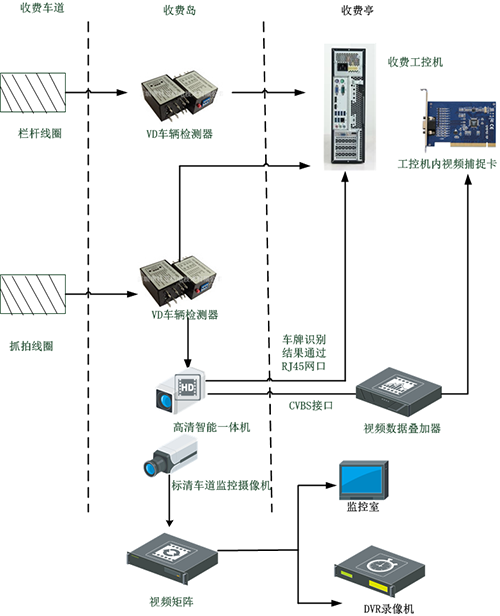 該方案把標(biāo)清識別攝像機更換為高清智能一體機,高清智能一體機通過CVBS接口輸出經(jīng)過裁剪(車輛頭部大圖,方便收費員看清車牌)的標(biāo)清視頻,通過視頻字符疊加器再連接至車道工控機中的視頻捕捉卡,收費流程保持不變。