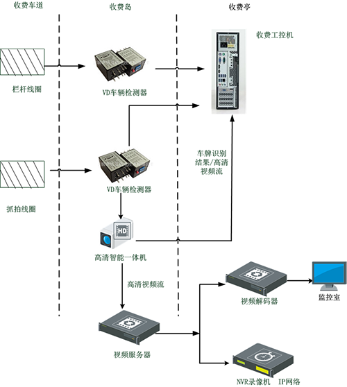 高清智能一體機取代標(biāo)清車牌識別攝像機、標(biāo)清車牌識別器、字符疊加器、視頻捕捉卡,通過網(wǎng)絡(luò)將車牌識別結(jié)果、高清圖片、高清視頻流發(fā)送至車道工控機;車道收費軟件需進(jìn)行升級改造,實現(xiàn)高清化處理。