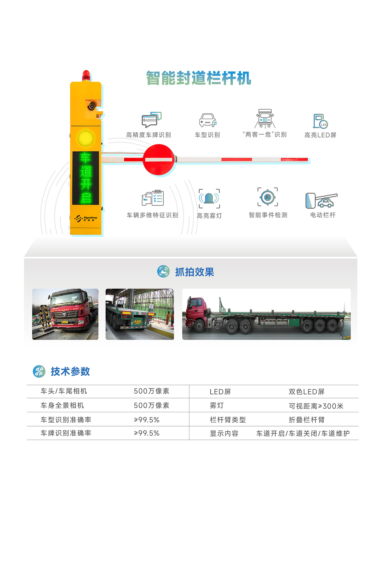公司研發(fā)生產(chǎn)的智能封道欄桿機(jī)采用一體化集成設(shè)計(jì),主要由電動(dòng)欄桿、車型識(shí)別單元、信息顯示屏、霧燈、報(bào)警器、補(bǔ)光模塊等構(gòu)成,具有車道開(kāi)關(guān)控制、車牌識(shí)別、車型識(shí)別、車道狀態(tài)指示、霧燈指示、聲光警示、自動(dòng)補(bǔ)光等功能,極大地減少了收費(fèi)站車道設(shè)備數(shù)量,降低了車道機(jī)電設(shè)備的占地要求,使機(jī)電維護(hù)更便捷,提高車道設(shè)備智能化水平,是為新型收費(fèi)站設(shè)計(jì)的一款高度集成化設(shè)備,符合收費(fèi)站輕量化發(fā)展趨勢(shì)。