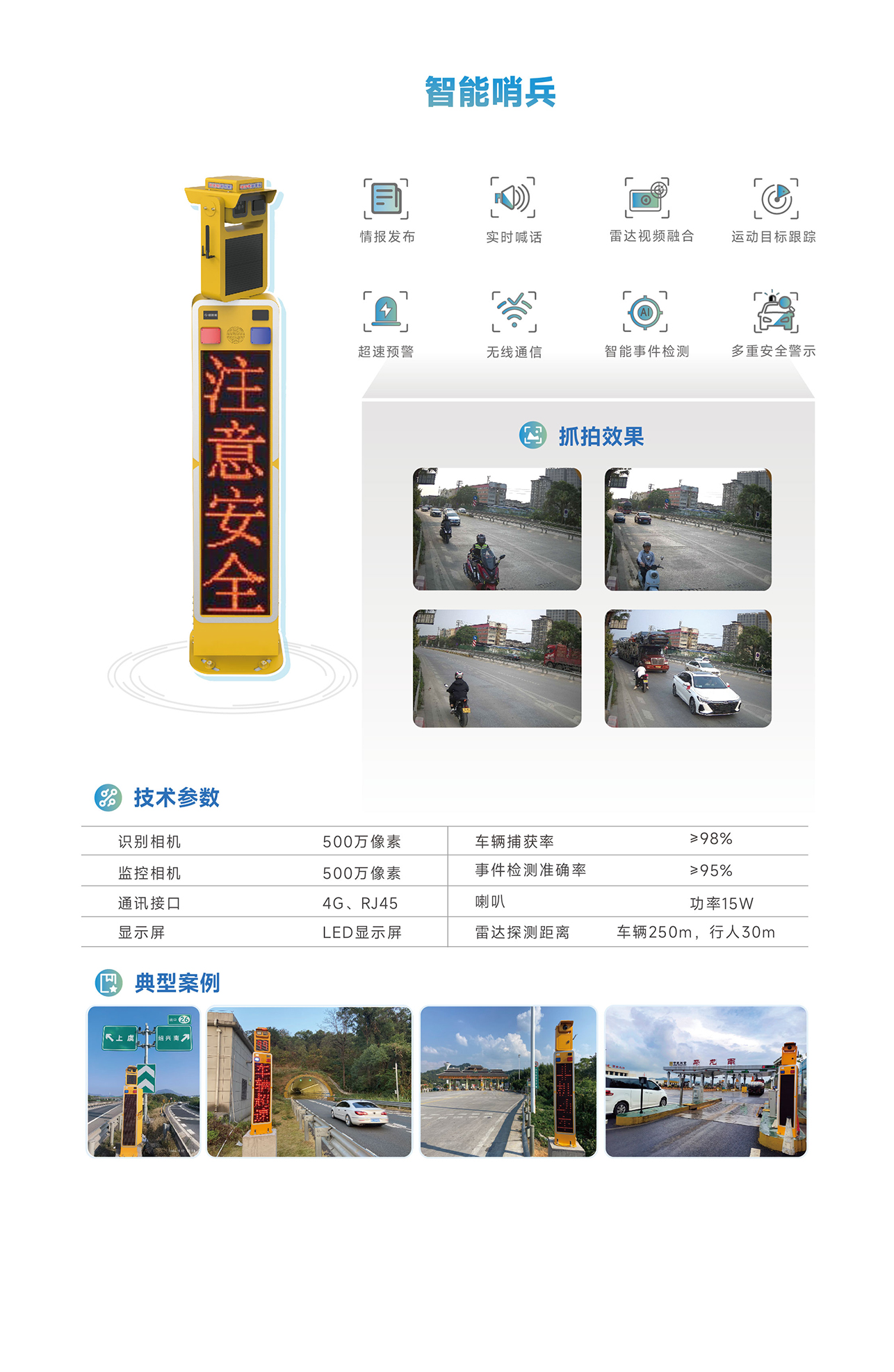 高速智能哨兵具有行人檢測、車輛檢測、車牌識(shí)別、超速預(yù)警、AI事件檢測、視頻監(jiān)控、告警信息展示(LED屏幕、語音、警示燈)等主要功能,實(shí)現(xiàn)行人、非機(jī)動(dòng)車、機(jī)動(dòng)車的實(shí)時(shí)檢測,并進(jìn)行精準(zhǔn)警示及主動(dòng)告警,適用收費(fèi)站入口匝道、公路分/合流匝道口、隧道口、邊坡/橋梁/高危路段等場景。